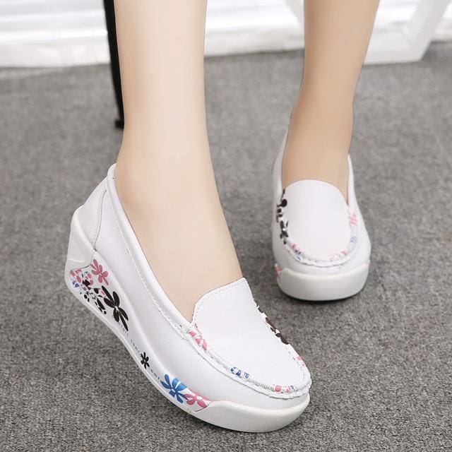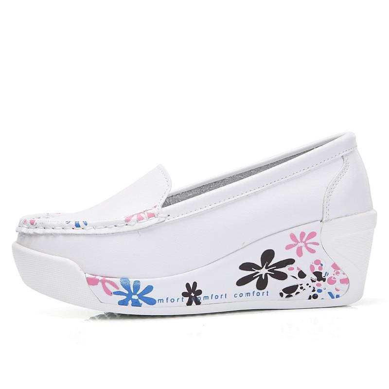 - Genuine Leather Platform Wedges White Lady Casual Shoes